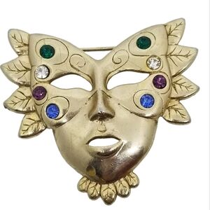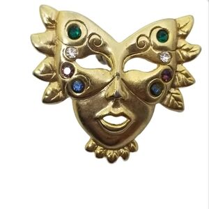 Fun vintage Mardi Gras style harlequin mask earrings and matching brooch set. Set is goldtoned and detailed with multi color rhinestones. Earrings measure 1-3/8 inches tall and 1-3/8 inches wide.  Brooch measures 2 inches tall and 2-1/4 inches wide. Great condition