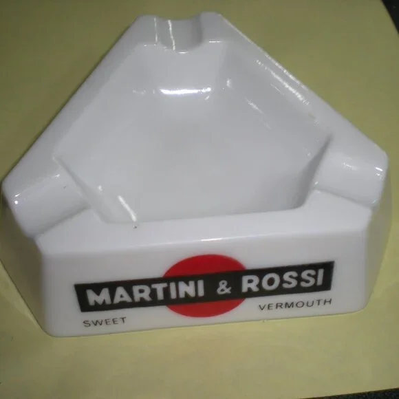 Martini & Rossi triangular ashtray. White Opalex is branded Martini & Rossi Sweet Vermouth on each side