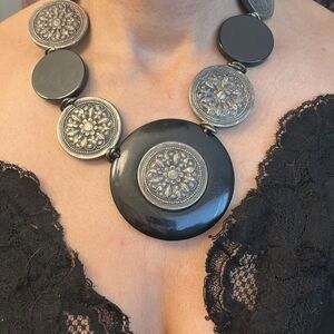 This stunning necklace features a bold black and silver design, perfect for adding a touch of elegance to any outfit.