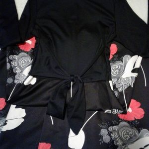 BEAUTIFUL FLOOR LENGTH MAXI DRESS! SOLID TOP WITH RED FLORAL BOTTOM. FAUX BOW BELT. HIDDEN ZIPPER ON BACK. LONG SLEEVE.