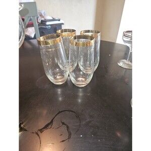 This vintage cocktail pitcher with four glasses and four martini glasses is the perfect addition to any drinkware collection. The elegant glass production style and heavy gold trim make this set a stunning piece for any occasion. The brand is unmarked, and the type is a cocktail pitcher. The color is gold, and the material is glass. This set is considered vintage, adding a touch of nostalgia to your barware.