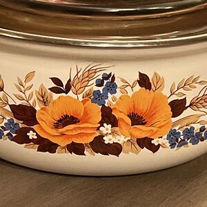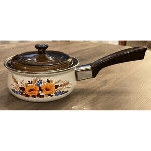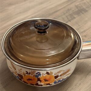 Vintage enamelware pot with glass lid. In good condition with some minor signs of use. Adorable floral pattern.