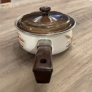 VINTAGE MCM Enamelware Sauce Pan Pot With Glass Lid 6.5”