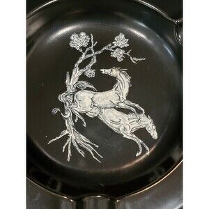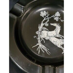 Vintage 1950s- 1960s MID century modern/MCM black ashtray or trinket dish. Crown Devon Fieldings Staffordshire England. Design is Pegasus. Black porcelain ceramic or pottery with white transfer horses and branch.