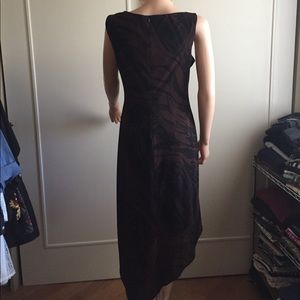 Interesting neckline, fully lined, polyester with unusual hemline. This dress can be worn year round in dark brown and black and to any occasion it is vintage, worn twice in good condition and very in trend today