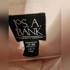 Introducing our Vintage Men's Jos A Bank Tailored Fit Pastel Pink Dress Shirt, a timeless addition to your wardrobe. Crafted with meticulous attention to detail, this shirt exudes sophistication and style. With a size of 17-36, this shirt is designed to fit perfectly, enhancing your silhouette and showcasing your impeccable taste. Hang it on your closet door and let it be a statement piece in your collection.