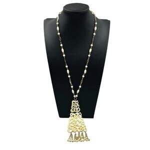 Up for sale, a very nice vintage tassel pendant necklace. It is in very good preowned condition and is a lightweight plastic material. It measures approximately 24” long, the pendant measures 2 1/4” x 5 1/2”.