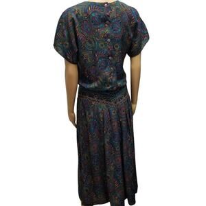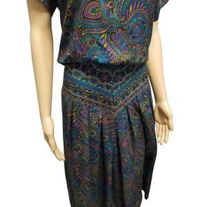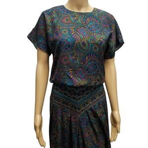Vintage midi paisley floral short sleeved loose fit top part with fitted waist and a skater skirt bottom. Lined top with 6 buttons on back. 10" zipper on back of skirt.
