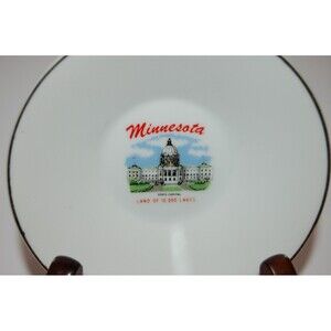 This vintage Minnesota State Capital souvenir plate / trinket dish features a gold trim design and showcases the theme of " Land of 10,000 Lakes ". Made of ceramic and standing 1" tall with a diameter of 4.25 inches, this decorative collector plate is a unique piece that pays tribute to the American culture and mid 20th-century era. The gold border and multicolor depiction of the state capital adds a touch of nostalgia and charm to any collection, making it a special item for collectors of vintage memorabilia.