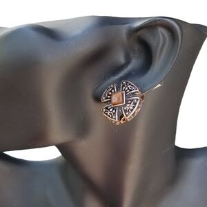 Beautiful vintage earrings by MK Company are copper colored steel renaissance revival style crosses with faux stone detail. Earrings measure 7/8 inch tall and 7/8 inch wide. Clip on style backs. Earrings stamped MK or inside of earring. Geat condition.