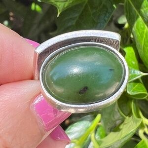 VINTAGE MODERNIST DESIGN JADE NEPHRITE CABOCHON RING 925 STERLING SILVER UNIQUE