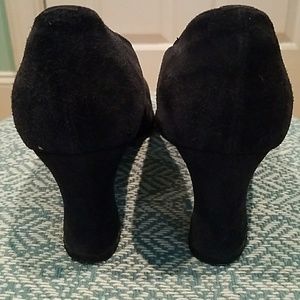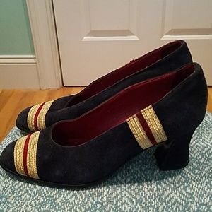 Love these blue suede shoes with gold and red stripes. Funky heel, mainly wear on the sole.