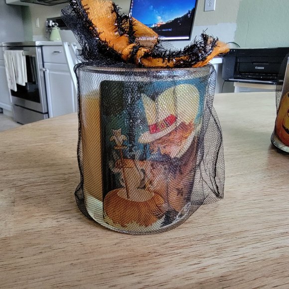 "REALLY CUTE and UNIQUE " COLLECTIBLE HALLOWEEN GLASS GIFT CANDLES..NEW>>>.NEVER USED This NO LONGER AVAILABLE RETIRED by Moonlight and Roses candle measuring approximately 3 3/8" tall X 2 3/4" in diameter is decorated with a vintage image taken from an old greeting card or postcard . A creamy orange shade candle has a smiling Witch motif...she is stirring her Pumpkin Cauldron and also has just a touch of glitter.The candles is topped by a removeable plastic cover (on the candle itself)to keepit fresh and are delivered inside a fine black netted bag and festive Halloween colored bow. It smells WONDERFUL!!VERY MYSTERIOUS AND HALLOWEENY!!!