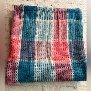 VINTAGE MULTI COLORED PLAID BLUE/PINK/WHITE WITH PINK SATIN TRIM BLANKET