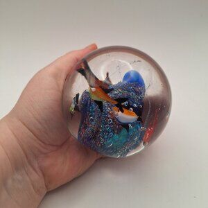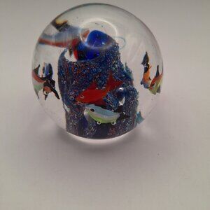 Vintage Murano-style art glass fish aquarium round paperweight. This spherical glass piece features an intricate underwater scene with several small, colorful fish swimming around a blue coral reef. The design includes controlled bubbles and vibrant color, creating a captivating ocean scene. It is unmarked and the bottom is not polished. Preowned and free from chips or cracks, it measures 3" round and weighs 1 lb. 12.6 ounces. Please see photos as they are part of the description. Smoke free home.