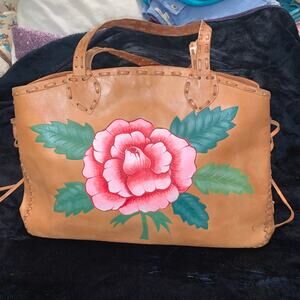 OUTSTANDING VINTAGE PIECE . HUGE ROOMY HANDPAINTED LEATHER TOTE BAG BY MYSTIQUE. 17 x 12 x 7. WHIPSTITCHING ALL AROUND. BACK IS TOOLED WITH FLORAL DESIGN. DOUBLE HANDLES FIT OVER SHOULDER. WORN ONCE AND STORED AWAY. EXCELLENT CONDITION. EXPANDABLE SIDES WITH LEATHER TIES.