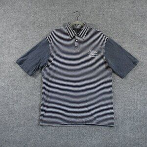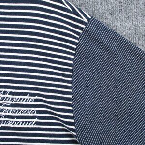 The VINTAGE Marithe Francois Girbaud Men's XXL Blue Striped Shirt features an embroidered logo and a classic, oversized design.