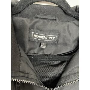This is a vintage Members Only black bomber jacket in size Large. It is made of polyester with a softshell fabric type and nylon lining. The jacket features a full zip closure, stand-up collar, and elastic waist. It is lightweight, breathable, and suitable for all seasons. The design includes logos, is oversized, and has pockets. The jacket is part of the Members Only Iconic Racer model line and is themed around nature, movies, art, and various other styles.