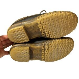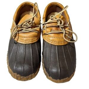 VINTAGE Mens LL BEAN Maine Hunting Shoe Boots Duck Leather Rubber Mocs 8M. These have been loved and are vintage.  The shearling fur lined insoles have some balding. The outside rubber have discoloration and some cracking. See pics. Smoke free home.