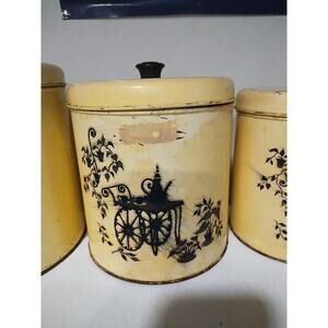 VINTAGE Metal YELLOW CANISTER Tins With Lids Pantry Kitchen Storage Set Of 4