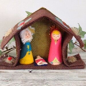 VINTAGE Mid Century Modern Cloth Burlap Creche Manger Scene