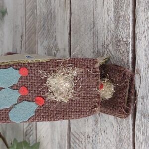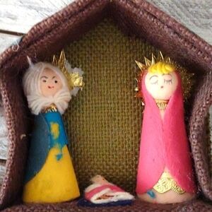 Base is cardboard, covered in burlap. Figures are covered in felt. Gold paper stars behind the heads of Joseph and Mary. Measures approx. 8" l x 5" h x 2" wide.