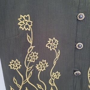 Vintage Miss Dorby Maxi Dress Size 12 Dark Green Embroidered Gold Floral Detail Back Tie Zip Closure Shoulder Pads