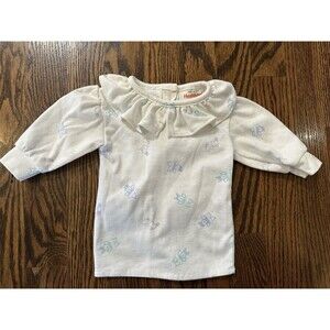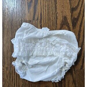 Gloves net, Bloomers some wear/slight rips to lace, Pink onesie- wash wear, Yellow puppy sleeper-wash wear and hole in one toe, White cardigan- VGUC, White top with print- some wash wear, Bonnet- EUC, Yellow bunny sleeper- lots of wash wear, White topslight wear to edges but otherwise VGUC and probably close to size 3t, Yellow onesielots of wash wear, White beach onesiewash wear and holes at armpits, White printed snap up onesie wash wear