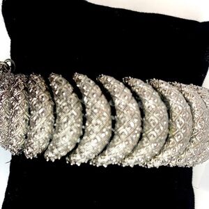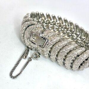 This Vintage Monet 60’s Etched Silver Tone Link Bracelet and matching clip earrings is RARE AND IN MINT CONDITION. Since the famous Monet paddle clips on the earrings still say “pat pend” then these are likely late 50’s to early 60’s. Monet is famous for these comfortable clips. The bracelet is 7.5” in length and still has safety chain attached. Clip on earrings unique as they are lovely measure approximately 1”.