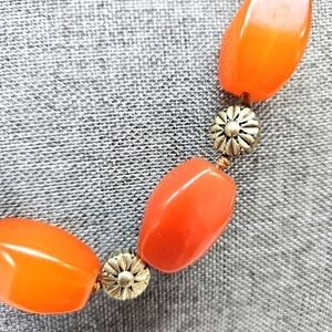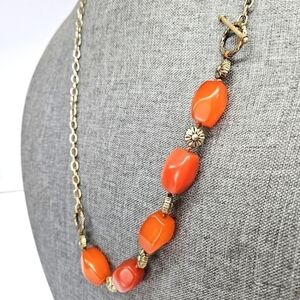 Vintage Monet gold-tone necklace with burnt orange color stones and small flower beads. Sits off-set with a toggle clasp close. Could also be worm more centered as shown. Maker's mark hang tag on toggle. Measures about 28". Excellent condition and smoke-free home.