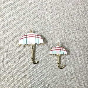 VINTAGE Mother of Pearl Umbrella Brooch Pins. The pins are in excellent condition and have red and green stripes on front and a gold tone back and handle. Clasps and pin works great!