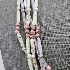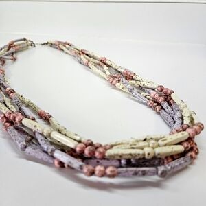 Gorgeous vintage multi-strand necklace. Pastel plastic beads with a goldish paint splatter design. Can be double looped for more of a choker style. Spring clasp back close. Measures about 29". Purchased from an estate and no visible maker's mark. Excellent condition and smoke-free home.