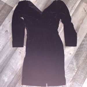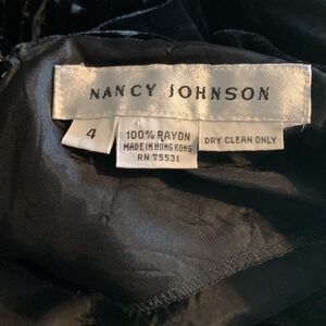 Vintage—- Nancy Johnson velvet — V-neck —cocktail dress. Size 4. 100% rayon. This dress is absolutely stunning! In the light, you can see some background floral/vines print. Has slight shoulder pads approximate 3 inches wide — v-neck on the front as well as the back of this dress. There is a full zipper that goes to the hip area. This beauty is fully lined, including the sleeves. Measurements are as follows. Pit to pit is 18 inches. —waist Measurement is 13 inches hips measurement is 17.5 inches and the length from the top of the shoulder to bottom hemline is 35 inches. Christmas Party/Wedding attire!! Smoke and pet free home!!!