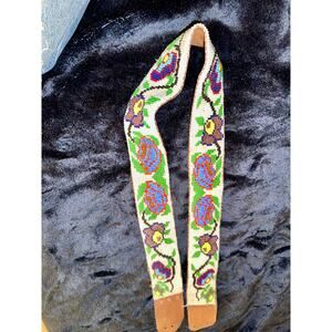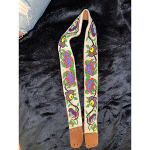 BEAUTIFUL NATIVE VINTAGE BELT WITH INTRICATE BEADWORK HANDSEWN TO A BACK OF SUEDE . NEEDS A COUPLE OF SUEDE LACES TO TIE IT TO AN ADJUSTABLE LENGTH. MEASUREMENTS IN PHOTOS (36" END TO END)
