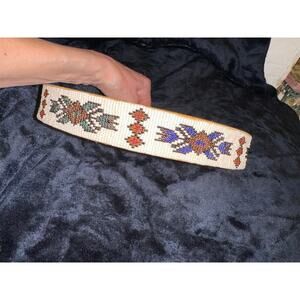 VINTAGE BEADWORK ON LEATHER BELT - 36" LONG AND 1.5" WIDE. THERE IS A PLACE TO SNAP ON A BUCKLE.