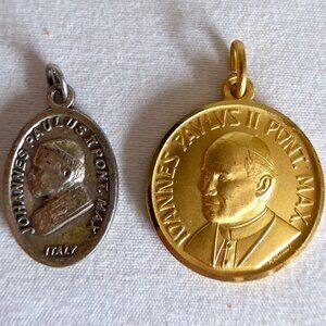 Vintage, new, never used for their purpose, Pope John Paul II, double sided, holy medallion / medals / charms / pendants. One is in a gold metal. The other is a silver metal. (See photos for details) I am the original owner. It has been in climate controlled storage since purchased at the Vatican in Italy. Comes from a pet and smoke free home.
