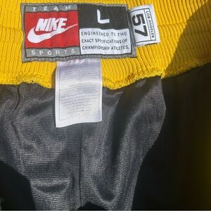 The product is a vintage Nike Rewind Los Angeles Lakers 57 black and gold NBA jersey shorts in size L. These basketball shorts feature the iconic colors and team logo of the Los Angeles Lakers, making them a perfect fan apparel item for supporters of the NBA team. Made by Nike, a trusted brand in sports apparel, these shorts are a stylish and comfortable way for fans to show their team pride while staying active or lounging.