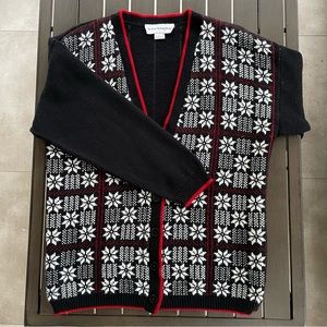 -Vintage -Winter/snowflake design -V-neck -Front button closure -Black, white, and red -Top to bottom measurement = 26” -Pit to pit measurement = 21” -Sleeve measurement = 20" -Great condition! -Smoke-free/pet-free home