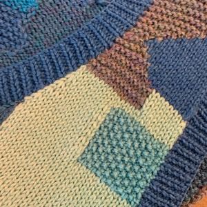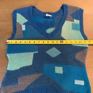 Stylish sleeveless sweater vest. Features a geometric pattern. V-neck design. This vintage sweater vest is soooo cool but just didn’t work with my body type.