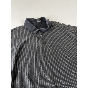 Classic vintage Nike Golf polo shirt in men’s size XXL. Features a black base with white pinstripe and micro-dot pattern, short sleeves, and a soft cotton-blend feel. Traditional Nike Golf logo tag inside. Perfect for casual wear, golf, or adding a retro touch to your wardrobe.