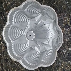 Very Noce Pan. looks like evergreen trees around the base, looking down into the cake middle looks like a flower, Poinsettia. Nice sturdy piece in great condition
