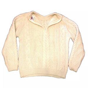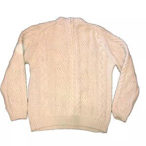 VINTAGE OFF WHITE CABLE KNIT SWEATER SZ L100% VIRGIN WOOL BACK ZIP HIGH NECK