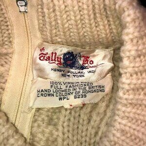 This Tally Ho vintage off white cable knit sweater in size large is made from 100% virgin wool. It features a stylish high neck, rear zipper, and cozy cable knit design for a classic yet chic look.