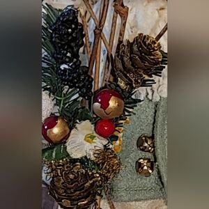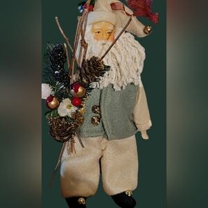 FEATURES: SANTA CLAUS HANDS AND FACE ARE MADE OF PORCELAIN & HOLDING A BUNDLE OF STICKS, PINECONES AND HOLLY