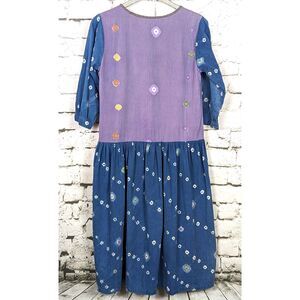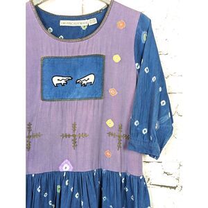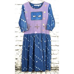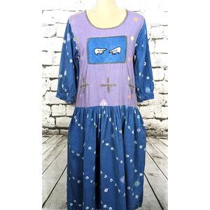 Quirky, unique midi dress with appliques and embroidery. Pullover styling. Drop waist. 3/4 sleeves. Cotton. Machine wash.