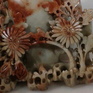 THIS IS THE LARGEST, MOST COMPLEX AND COLORFUL OF ALL THE SOAPSTONE SCULPTURES IN MY FATHERS ESTATE. THE COLORS ARE REDS, GREYS, AND TANS. THERE ARE FLOWERS, LEAVES. AND VINES, A VASE, AND A BOWL.