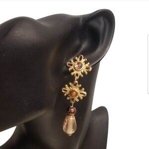 Stunning vintage goldtoned drop style earrings with art glass bead and cabachon detail. Earrings have stud style backs and measures 2-3/4 inches in length. Beautiful earrings great condition.