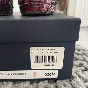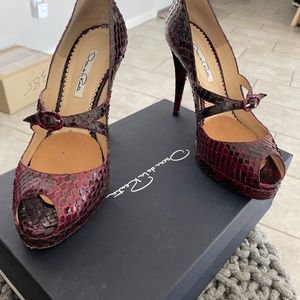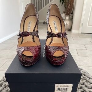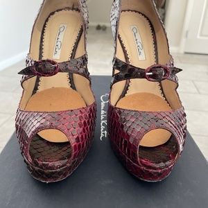 Oscar de la Renta Bordeaux Anaconda Snake Pumps in size 38 1/2. Front buckle and peep toe.