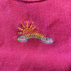 Bright pink tank top featuring a colorful rainbow and sun embroidery. Perfect for adding a pop of color to any outfit.