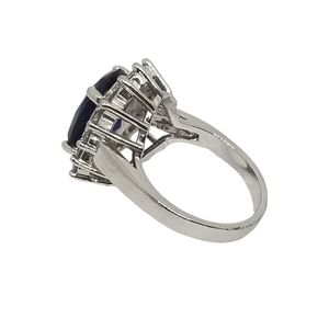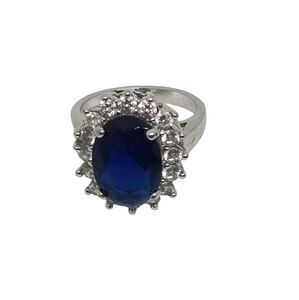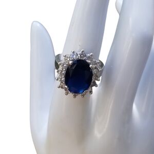 Beautiful classic style cocktail ring with large faceted oval cut deep blue sapphire colored glass stone framed with white glass stones and set in a silverplated band. Ring is a size 8.5 Ring is in like new condition.